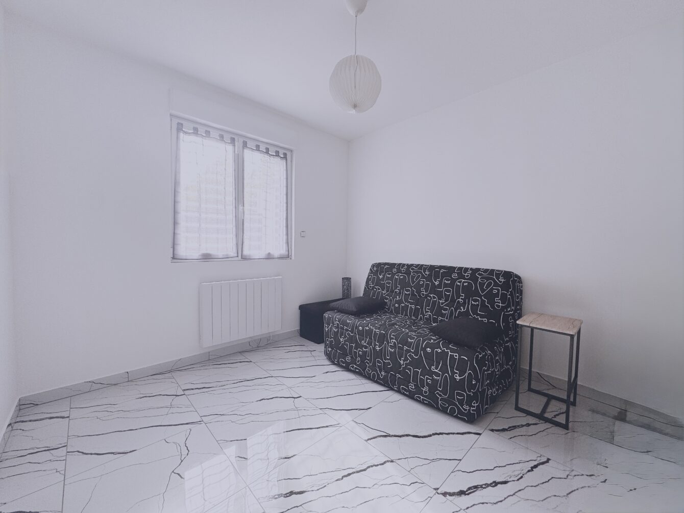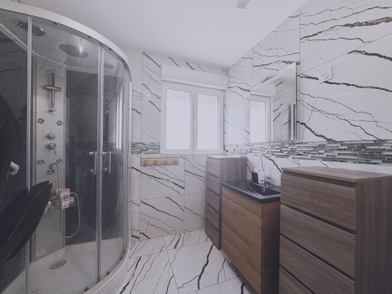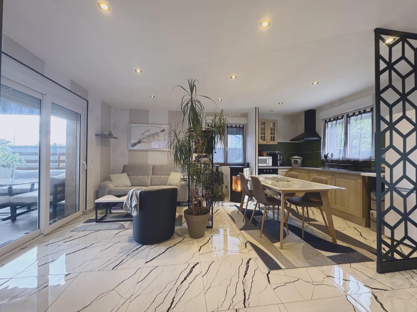 L’espace de vie se compose d’une entrée menant à un salon/séjour et à une cuisine équipée et fonctionnelle, de plus de 30 m², ouverte sur une terrasse couverte d’environ 12m².
